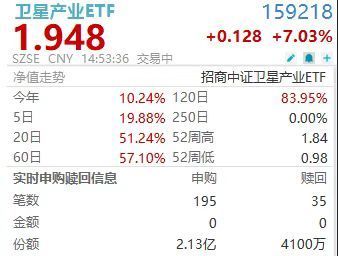 1月6日,卫星产业彻底爆发!数据显示,截至14时52分,表征板块的卫星产业ETF(159218)涨7.09%,前几大权重股方面,中国卫星涨7.59%,航天电子涨停封板,中国卫通涨停封板,中科星图涨3.94%,臻镭科技涨8.10%,交投持续升温,成交额超8亿再创历史新高。资金热度不减,据Wind Level2实时行情结合均价预估,盘中净流入超3.1亿!